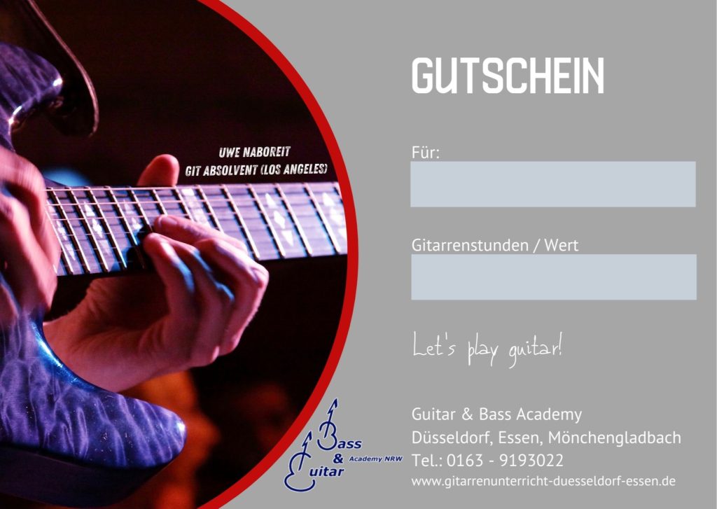 Euer Weg zum Gutschein ist ganz unkompliziert. Ihr meldet Euch bei Uwe Naboreit mit Eurer Idee. Uwe bespricht dann mit Euch die Möglichkeiten für Gitarrenunterricht in Düsseldorf / Essen und den Einsatz eines Gutscheins.